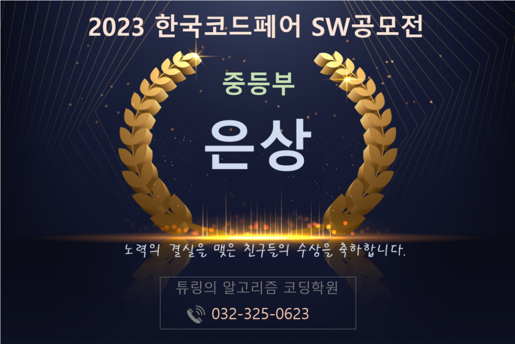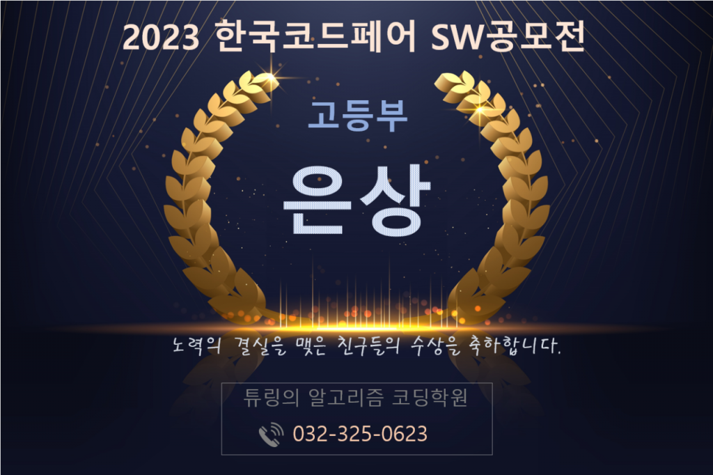 Contest 본원은 공신력 있는 전국 최고 수준의 소프트웨어 공모전에2021년부터 원생을 내보내기 시작해서 해마다 최상위 성적을 거두고 있습니다. 2021 포스코DX AI Youth Challenge 지능정보산업협회장상 수상 (2등상) 2022 포스코DX AI Youth Challenge 과학기술정보통신부 장관상 수상 (1등상) 제5회 한국코드페어 SW공모전 중등부 한국지능정보사회진흥원장상 (3등상) 제5회 한국코드페어 SW공모전 고등부 한국지능정보사회진흥원장상 (3등상) 제6회 한국코드페어 SW공모전 고등부 국무총리상 (1등상)